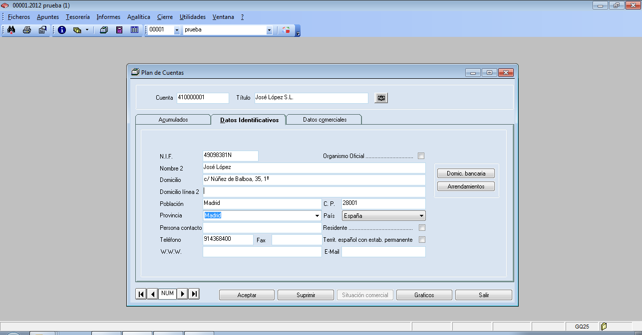 En el caso de cuentas de clientes o proveedores, el programa habilita otras dos carpetas que contienen una serie de datos exclusivos de este tipo de cuenta: Datos identificativos y datos comerciales, los cuales serán utilizados por otras opciones del programa.