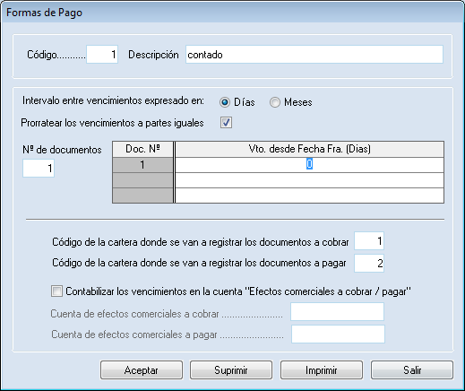 - Conceptos automáticos, tipos de diario, tipos de cartera, documentos y formas de pago.