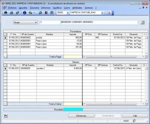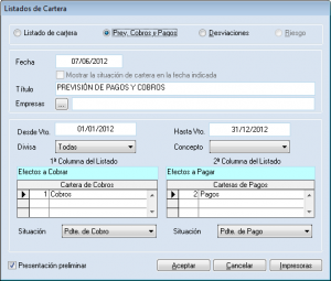 Este informe, como su propio nombre indica, permite obtener la relación de cobros y pagos realizados en el ejercicio. El interface es prácticamente idéntico al de análisis de riesgo. Simplemente debe seleccionar cual de los dos resúmenes desea obtener, sobre qué carteras y el rango de clientes o proveedores.